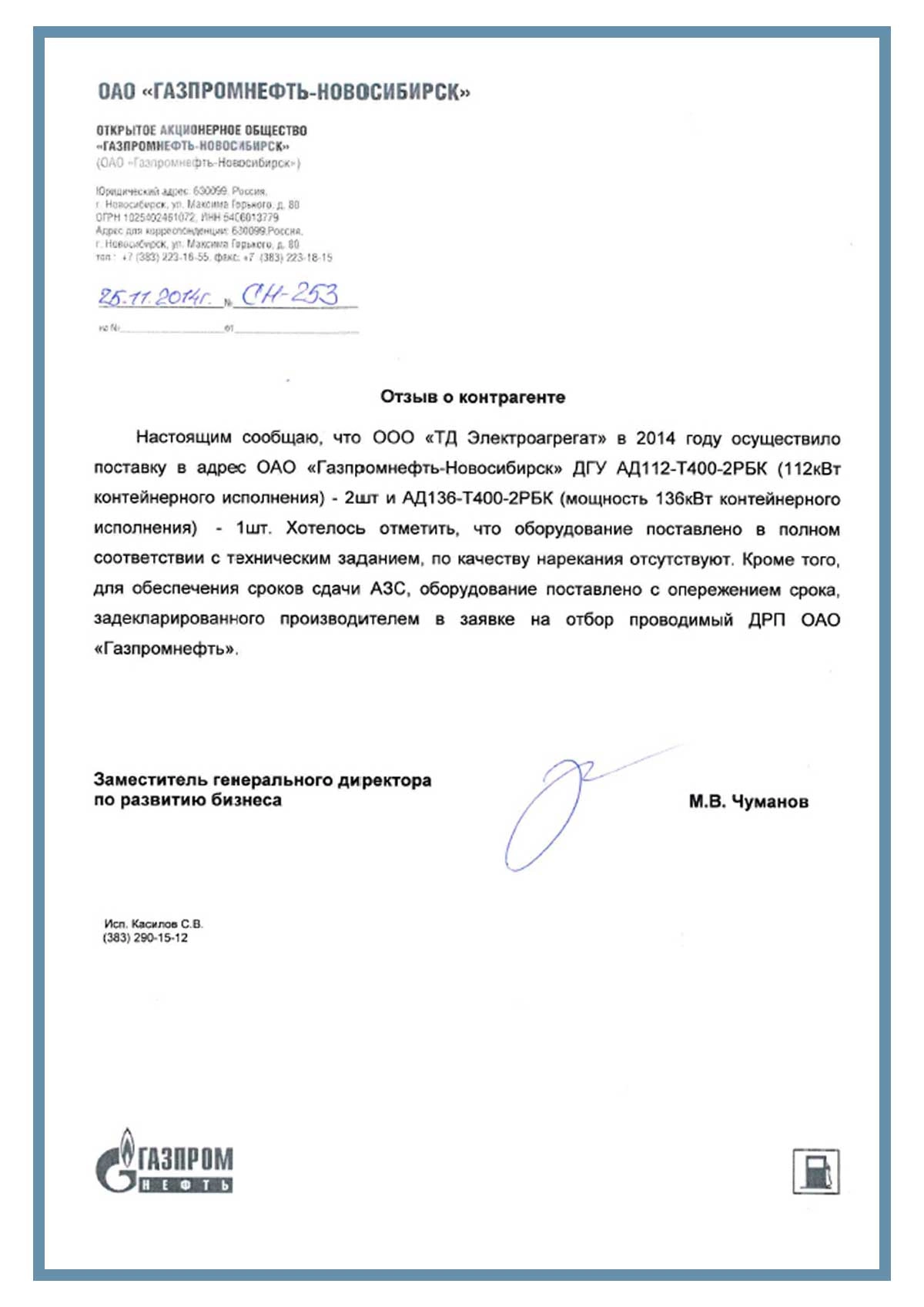 Отзыв контрагентов о компании ООО «ТД Электроагрегат» и  исполненном проекте для ОАО «Газпромнефть - Новосибирск», г Новосибирск